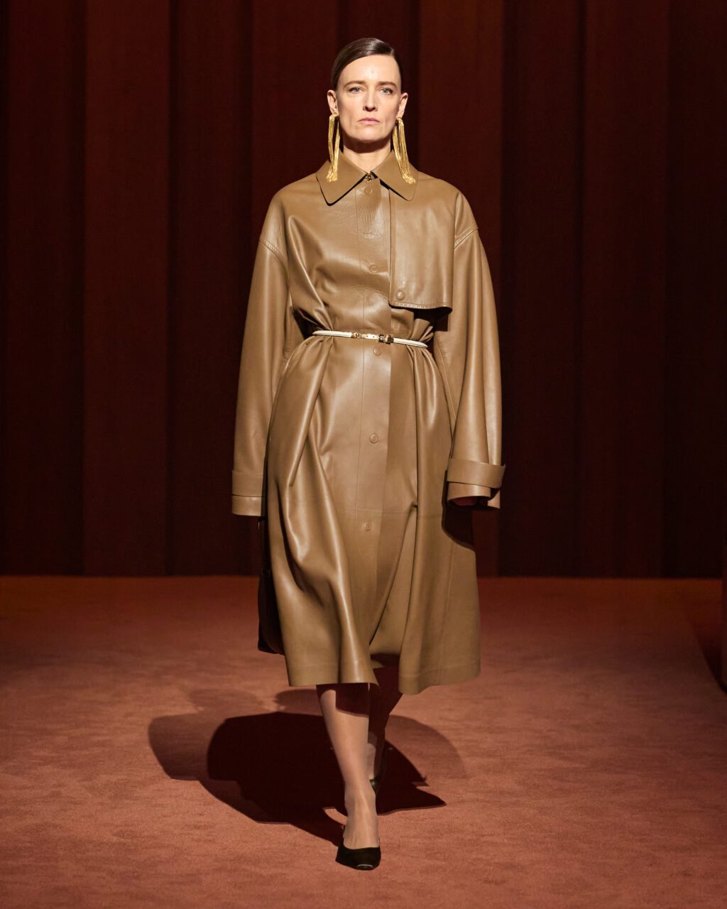 Açılış siluetinde, dokular göz yanılsaması yaratıyor. Sonsuzluğa gönderme yapan kum saati formu, saten balza eteklerde, volanlı ceketlerde ve yuvarlak kollarda kendini gösteriyor. Mermer desenli plise ve nervürlü trikolar kıvrımlı fırfırlara dönüşürken, yılan ve kuzu derisi yamalar A-kesim şerit eteklerde flare etkisi yaratıyor. Erkek giyiminde ham kesimli paltolar, gizli martingale detayıyla teatral bir hava kazanıyor. Renk paleti ise Roma’nın gün batımı tonlarından esinleniyor: defne yeşili, orman yeşili, grafit, çikolata kahvesi ve petrol mavisi gibi sakin tonlardan; tarçın, toprak, şeker pembesi, kaymak sarısı, parlak kırmızı ve pudra pembesi gibi göz alıcı renklere uzanıyor.
