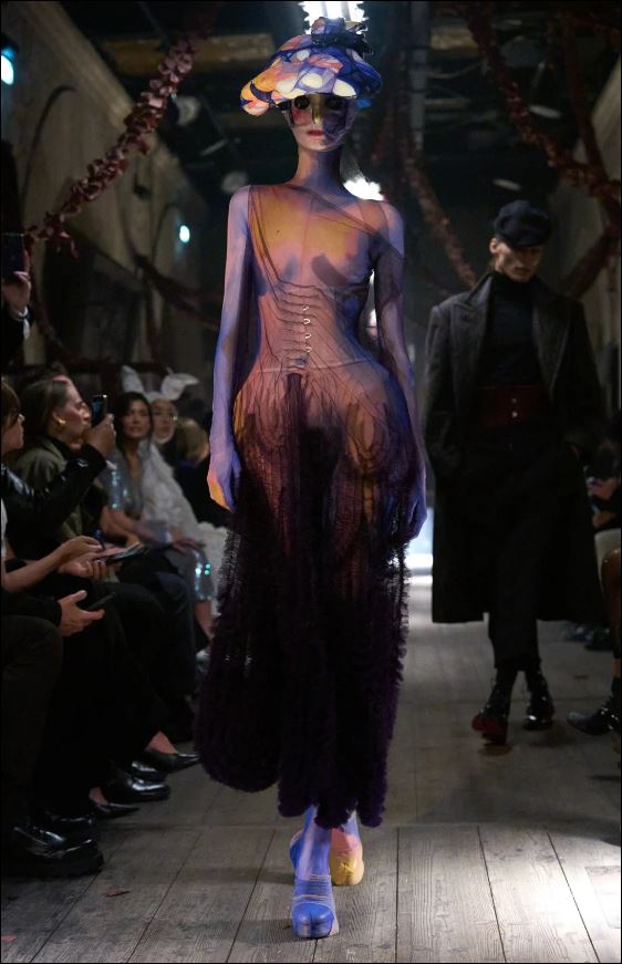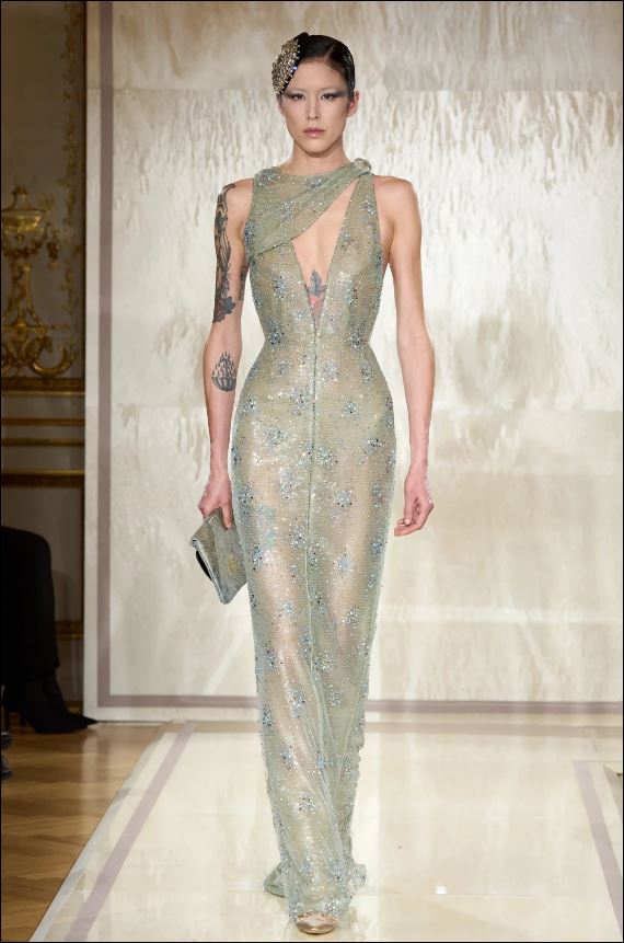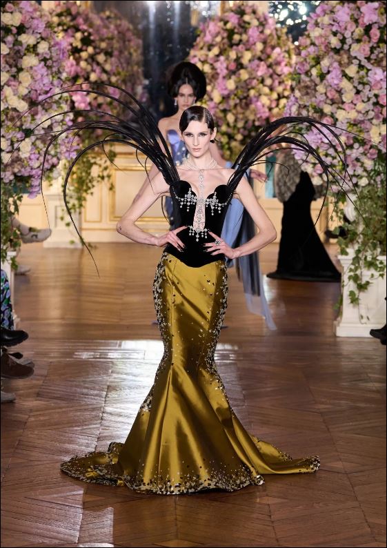 Ludovic de Saint Sernin, Jean Paul Gaultier’nin haute couture mirasını yorumlarken, “Le Naufrage” (Geminin Batışı) temasıyla büyüleyici bir koleksiyon sundu. İlhamını Seal ve Mylène Farmer’ın müzik videosundaki denizdeki gemi enkazı sahnesi ile Gaultier’nin 1997’deki gemi şeklindeki başlığından alan de Saint Sernin, denizaltı, yeraltı ve iç giyim unsurlarını harmanladı. Koleksiyon, mitolojik figürlerden transparan tasarımlara kadar uzandı. Gaultier’nin eğlenceli estetiğine göndermelerde bulunarak, seksi ve sofistike tasarımlarına işçilikle zenginleştirilmiş yeni bir boyut kattı. Özellikle geleneksel plise Grès ve yenilikçi krokodil derisi gibi görünen lateks işçilikle hazırlanan parçalar, de Saint Sernin’in görsel zekasını ve couture’a dair ciddi yaklaşımını sergileyen bir koleksiyon ortaya koydu.