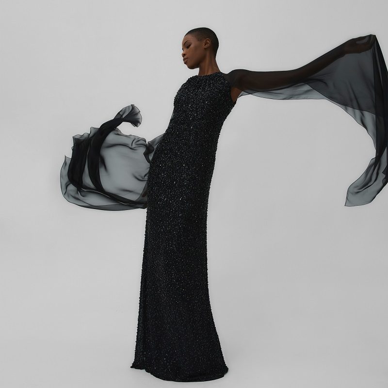 Koleksiyonda; Paris zarafetini çağrıştıran püsküllü işlemelerle işlenmiş uzun elbiseler, sırt dekolteli payetli kokteyl elbiseler ve katmanlı kristal tül silüetlerle tamamlanan uçuşan şifon pelerinler öne çıkarken bu güçlü detaylar, koleksiyonun kadınların kendi kimliğini cesurca ifade etmesine alan tanıyan zarif ama başkaldıran ruhunu yansıtıyor.