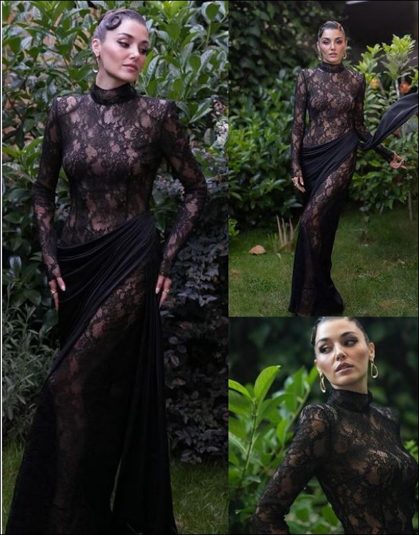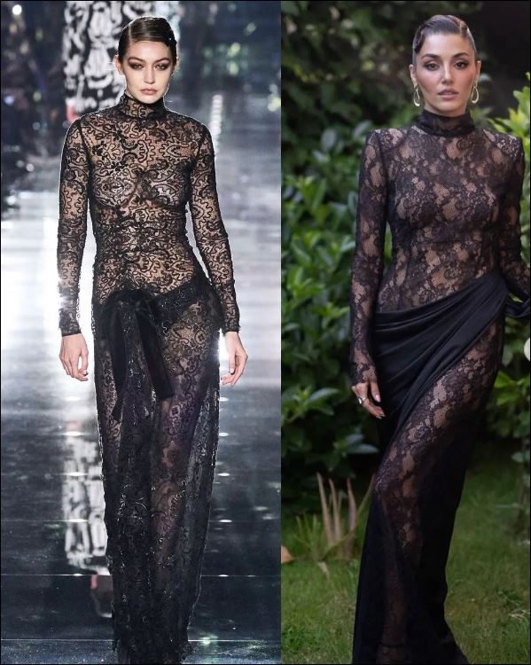 Hande Erçel’in transparan görünümlü Özgür Masur imzalı elbisesi Tom Ford’un Gigi Hadid tarafından giyilen elbisesini anımsattı.