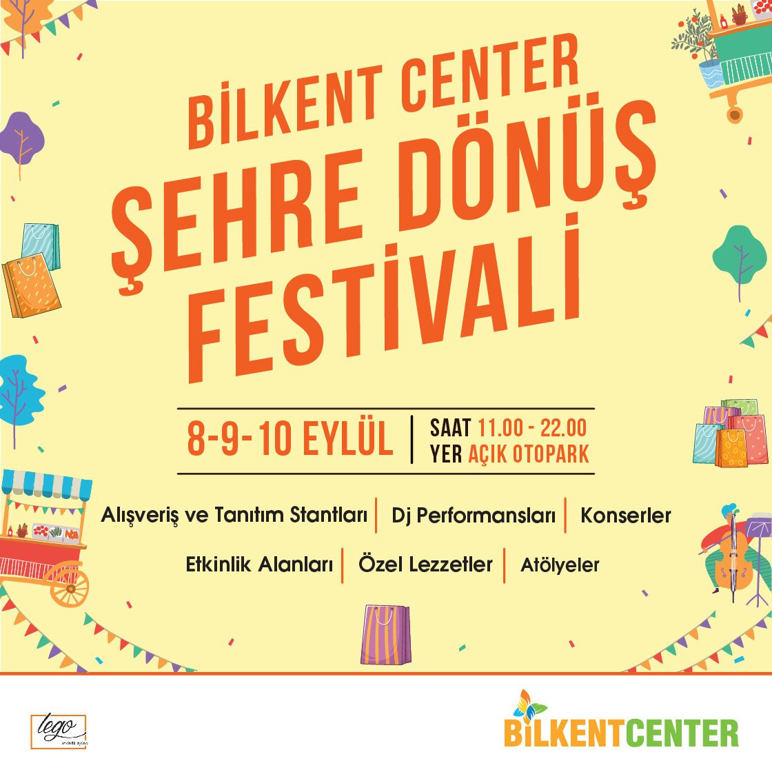 8-9-10 Eylül tarihlerinde gerçekleşecek etkinlikte; yaz tatili sebebiyle evlerinden uzak kalan, aradığı her ürünü tek çatı altında bulmak isteyen misafirlerini karşılayan Bilkent Center, birbirinden özel workshop atölyeleri, alışveriş- tanıtım stantları ile açık havada keyifli zaman geçirmek isteyenlere dolu dolu bir üç gün yaşatacak. Birbirinden eğlenceli konserler eşliğinde alışverişe coşkuyu ortak edecek Bilkent Center’ın ilk gün konukları; DJ Marii, Discover, Zeynep Türköz olurken, ikinci gün konukları Dj Ayşem, Vatkalı Ceket, Sütlü Kakao, üçüncü gün konukları ise; Dj Lorien, Bizimkiler-Sizinkiler ile Necati ve Saykolar. Rengarenk stantları ile ziyaretçilere birçok seçenek sunacak olan Şehre Dönüş Festivali, Bilkent Center açık otoparkında Başkentlileri bekliyor olacak.