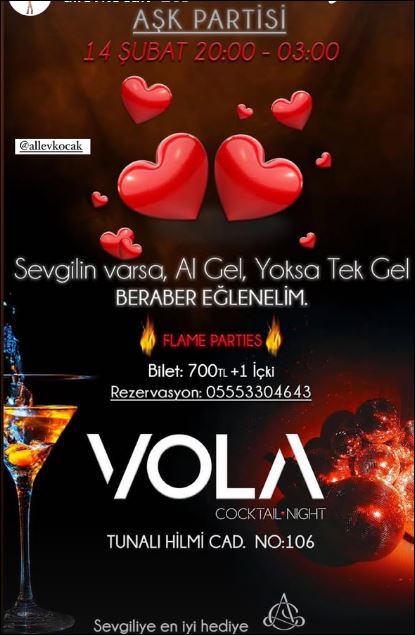 VOLA 14 Şubat’ta, aşk dolu bir partiye ev sahipliği yapacak. Sevgilin varsa al gel, yoksa sadece sen gel, beraber eğlenelim, sloganı ile aşk şarkılarının ritmiyle Sevgililer Gününü VOLA’da kutlamaya ne dersiniz?