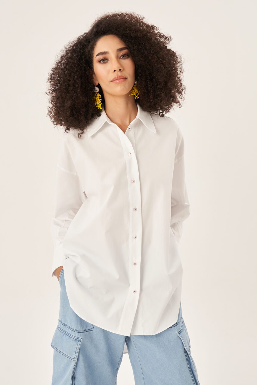 Gabi kadın gömlek, beyazın cazibesini kırmızı detayları ile adaların stiliyle birleştiriyor. Detaylı tasarımı ve şık duruşuyla her zaman için göz alıcı bir seçenek olan bu gömlek, özel tasarımı ile her dolapta olması gereken zamansız parçalardan.