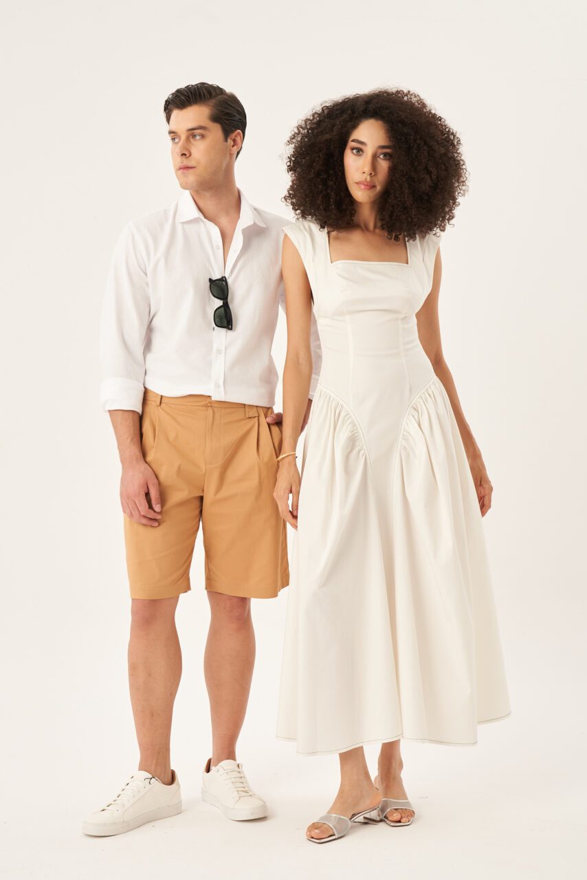Leandros şort, gabardin kumaşı ve İtalyan esintisiyle koleksiyonun en dikkat çeken erkek parçalarından biri. Erkeklerin hem tişört hem de gömleklerle rahatlıkla kombinleyebileceği bu şort, pileli tasarımı ile sizi bir adım öteye taşıyacak.