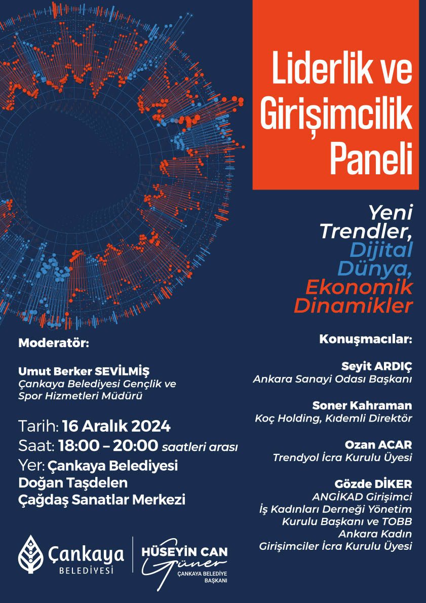 Çankaya Belediyesi tarafından hazırlanan “Liderlik ve Girişimcilik” paneli 16 Aralık tarihinde Çağdaş Sanatlar Merkezi’nde düzenlenecek. Yeni Trendler, Dijital Dünya, Ekonomik Dinamikler temasının ön plana çıktığı panelin moderatörlüğünü Çankaya Belediyesi Gençlik ve Spor Hizmetleri Müdürü Umut Berker Sevilmiş yapacak. Aynı merkez, 23-24 Aralık tarihlerinde ise “Fscongress Ankara” başlıklı kongreye ev sahipliği yapacak. 27 Kasım’da bildiri özeti gönderiminin tamamlandığı kongre, Türkiye’de ve Dünyada Yerel Yönetimler, Ekonomi ve Toplum genel teması ve Cumhuriyetin Kuruluşundan Günümüze Başkent Ankara özel temasıyla gerçekleşecek.