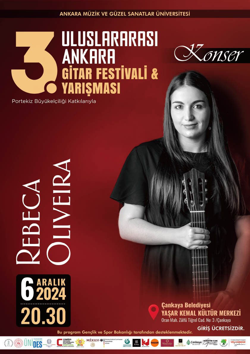 Peru Büyükelçiliği desteğiyle hazırlanan Ayacucho Savaşı’nın 200’üncü Yıldönümü Geleneksel And Müziği Konseri ise 4 Aralık tarihinde Çağdaş Sanatlar Merkezi’nde gerçekleşecek. Chano Diaz Limaco tarafından icra edilecek “AYACUCHO Özgürlüğün Sesleri” başlıklı etkinlik, ücretsiz olarak dinleyicileriyle buluşacak. Ankara Müzik ve Güzel Sanatlar Üniversitesi öncülüğünde organize edilen 3. Uluslararası Ankara Gitar Festivali ve Yarışması kapsamında ise Rebeca Oliveira konser verecek. Portekiz Büyükelçiliği katkılarıyla düzenlenen konser, 6 Aralık’ta Yaşar Kemal Kültür Merkezi’nde dinleyicilerini ağırlayacak.
