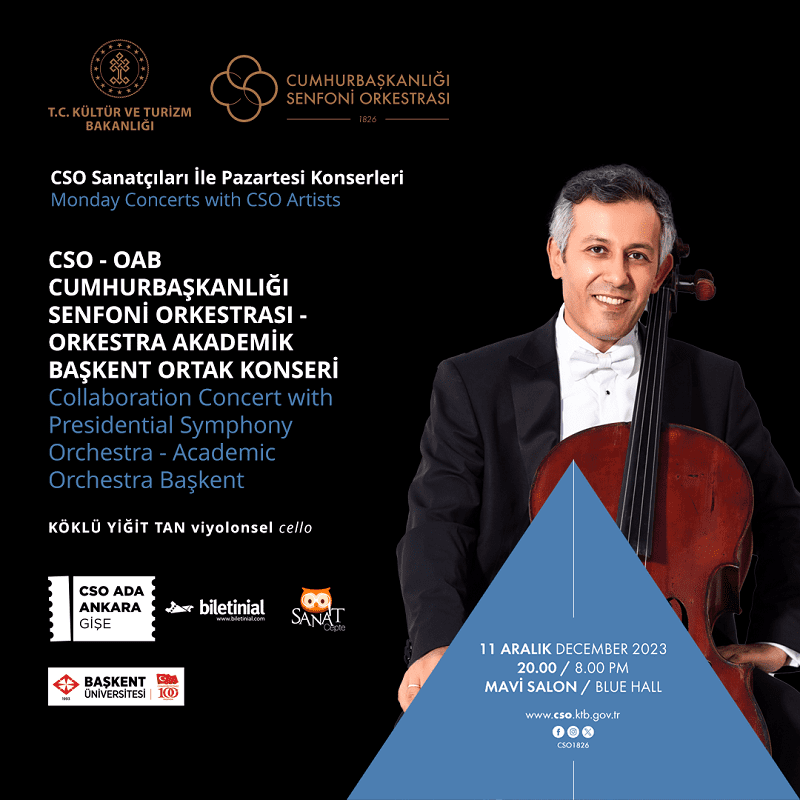 CSO Ada Ankara Mavi Salon’da gerçekleşen CSO Sanatçıları ile Pazartesi Konserleri serisi; 11 Aralık’ta Cumhurbaşkanlığı Senfoni Orkestrası ve Orkestra Akademik Başkent’in ortak konserine yer veriyor. Viyolonsel sanatçısı Yiğit Köklü Tan’ın solist olarak katılacağı konserde S. Bach Brandenburg Concerto no.3, Carl Philipp Emanuel Bach La Majör Çello Konçertosu, G.B. Sammartini Senfoni JC32 ve JC39 eserleri seslendirilecek.
