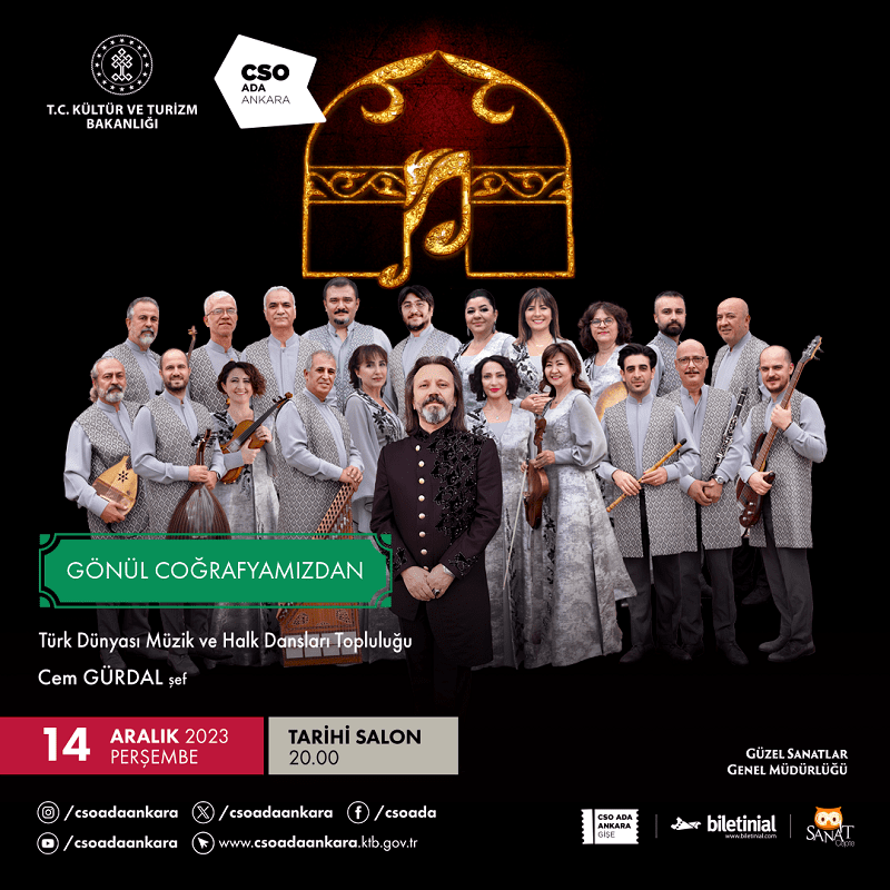 Türk Dünyası Müzik ve Halk Dansları Topluluğu, “Gönül Coğrafyamız” diye adlandırdığı Türk Dünyası coğrafyasının her köşesinden hazırlanmış bir müzik ziyafetini izleyicilere sunacak. Topluluğun orkestrası ve ses sanatçıları tarafından sahnelenecek seçkin konser, 14 Aralık 2023 günü saat 20.00’da CSO Ada Ankara Tarihi Salon’da gerçekleşecek.