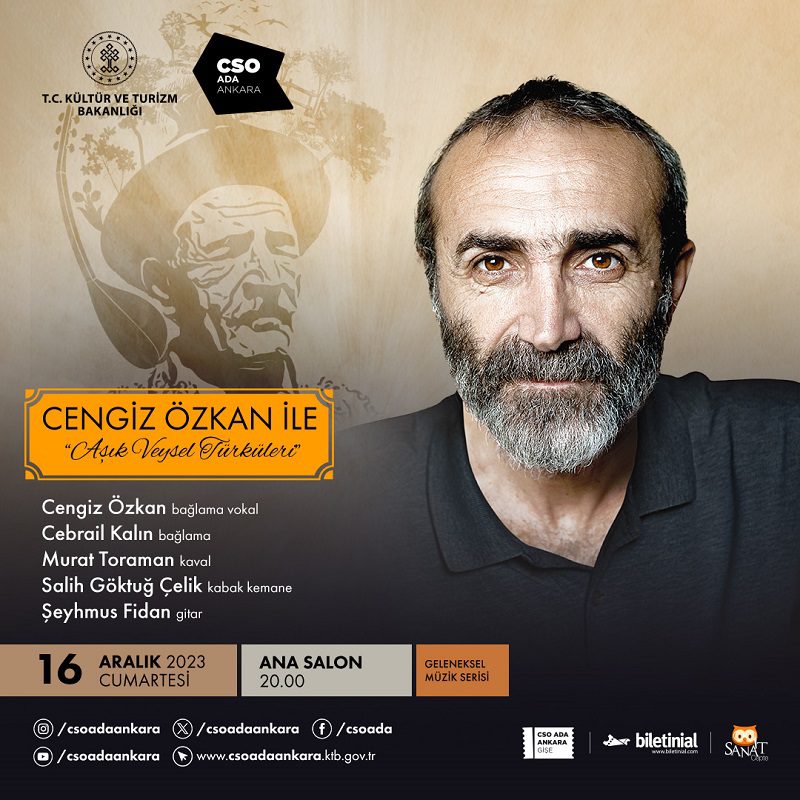 Türk Halk Müziği’nin usta ismi Cengiz Özkan, Aşık Veysel türkülerini 16 Aralık Cumartesi günü CSO Ada Ankara Ana Salon’da seslendirecek. Cengiz Özkan’ın bağlama ve vokal, Cebrail Kalın’ın bağlama, Murat Toraman’ın kaval, Salih Göktuğ Çelik’ın kabak kemane ve Şeyhmus Fidan’ın gitar performansıyla yer alacağı konser için özel bir repertuvar oluşturuldu.