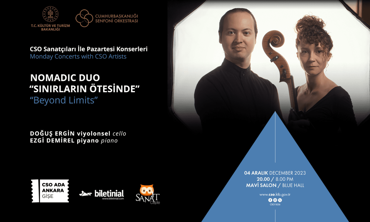 Cumhurbaşkanlığı Senfoni Orkestrası’nın oda müziği konserlerinden ‘Sınırların Ötesi’nde vurgusunu yaptığı Nomadic Duo konseri, 4 Aralık Pazartesi CSO Ada Ankara Mavi Salon’da sanatseverlerle buluşacak. Konserde, Doğuş Ergin çello ve Ezgi Demirel piyano performanslarıyla sanatseverlerin huzurunda olacak.