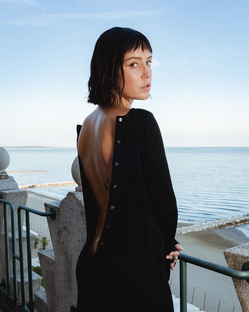 Adèle için tasarlanan elbise, Chien 51’in dramatik sinemasal dünyasından ilham aldı. Filmdeki kadın karakterin taşıdığı güçlü, isyankar ve kaderci ruh, elbisenin her detayında kendini hissettirdi. Siyah renk tercihi, hem filmin estetik evrenine hem de Lacoste’un zamansız moda mirasına güçlü bir gönderme niteliğindeydi. Markanın ikonik polo tişörtlerinden esinlenerek geliştirilen dokulu piqué Emil jarse kumaş, zarif bir siluet yaratırken, sportif mirası couture çizgilere taşıdı. Tasarımın merkezinde ise, Lacoste polosunun tersten giyilerek dramatik bir sırt açıklığıyla yeniden yorumlanması fikri yer aldı. Sırt hattını takip eden düğmelerle tamamlanan bu sıra dışı yapı, bel hizasına kadar uzanan çarpıcı bir dekolteyle birleşerek minimal ama son derece etkileyici bir görünüm sundu.