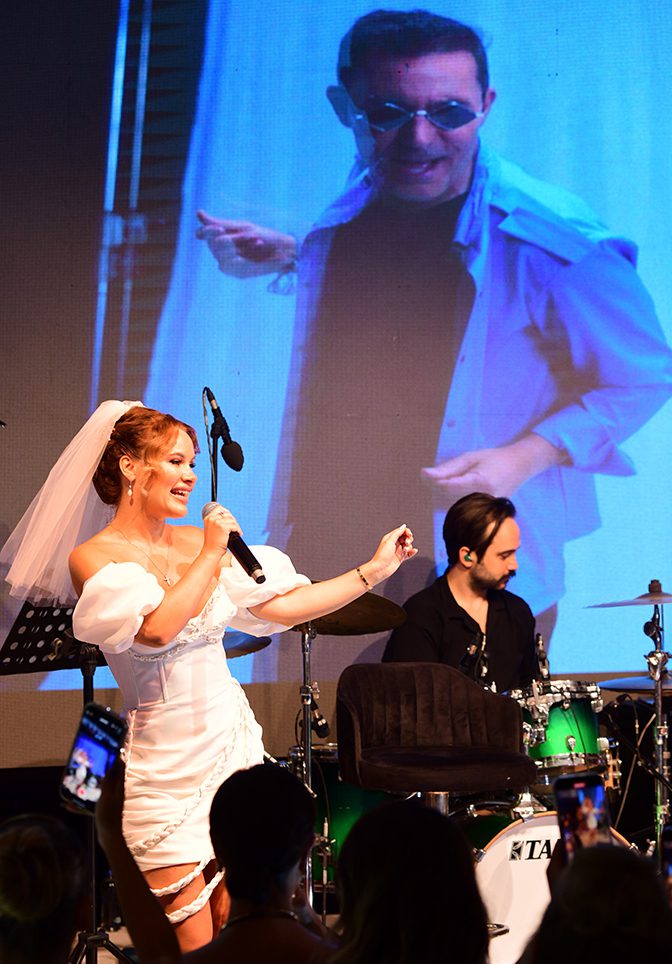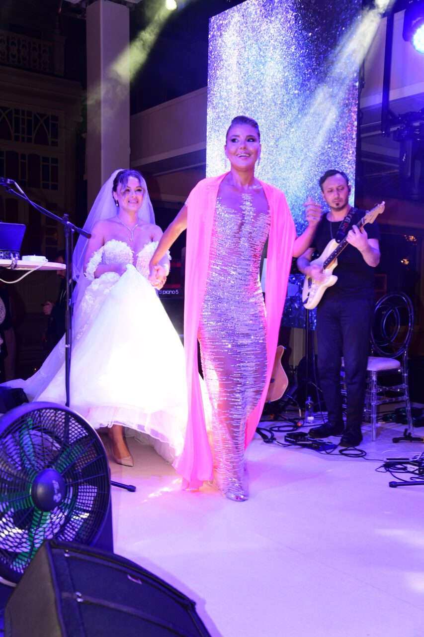 Gecenin sanatçısı olan Gülben Ergen sahneye gelin Olga Napoli ile el ele tutuşarak birlikte çıktılar. Çalan oyun havası eşliğinde sahnede karşılıklı oynayan ikili renkli görüntüler verdiler. Gülben Ergen bugüne kadar çok düğün töreninde ve konserlerde sahneye çıktığı çıktığını belirterek “Bugüne kadar sahneme hiç gelin çıkmamıştı. İlk kez sahnemde gelin var” dedi. Şarkıları ile davetlileri coşturan Gülben Ergen, güzel sesi ile dikkat çeken Olga Napoli’yi sahneye çıkararak şarkı söylettirdi. Mustafa Sandal ile düet yaptıkları “Sana ihtiyacım var” adlı şarkıyı klibi eşliğinde seslendiren Olga Napoli’ye Gülben Ergen’de eşlik etti ve “Mustafa Sandal ile çok güzel bir düet çalışması yapmışsınız. Mustafa Sandal burada yoksa ben varım” dedi. Mustafa Sandal’da işi nedeniyle Bursa’da olduğu için düğüne video mesajı göndererek çifte mutluluklar diledi. Gülben Ergen gelin Olga Napoli’nin yanı sıra damat Ahmet Çiğdem, damadın kız kardeşi Gülten Pehlivan ve Pars Medya’nın ortağı olan Kurban Akar’ı da çıkartarak hep birlikte şarkı söylediler…