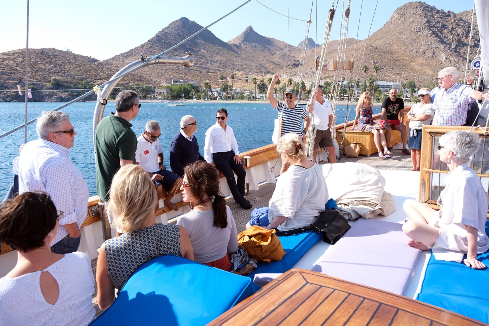 Bodrum Belediye Başkanı Ahmet Aras, EDAM üyeleri ve davetlileriprogramın ikinci gününde, Türkiye’nin ilk ve tek yelkenli okul gemisinde ağırladı. Katılımcılar, STS Okul gemisinin mimarlarından Yücel Köyağasıoğlu’ndan geminin yapım aşaması ve kullanım alanları hakkında bilgi alırken Başkan Aras da bölge hakkında bilgiler verdi.