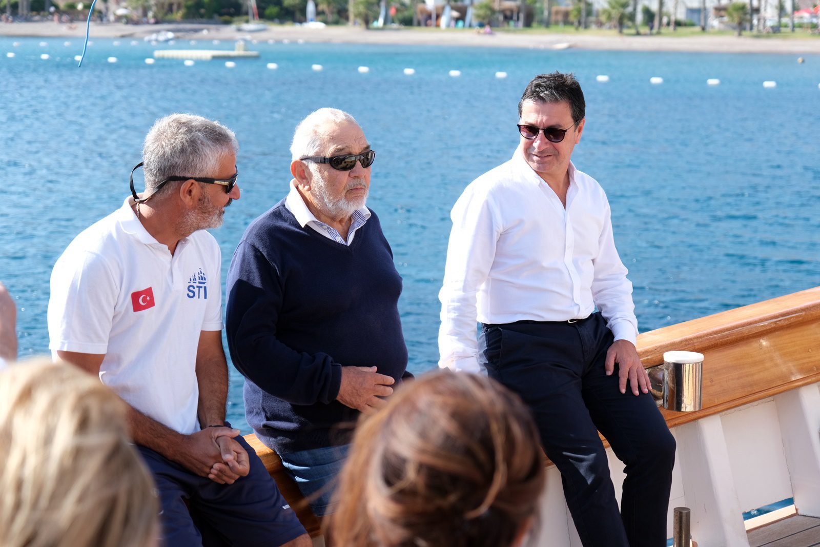 Yelkenle seyir yapılırken Bodrum ahşap yat imalatının Türk ve Dünya denizciliğindeki önemini ve yapılan çalışmaları anlatan Başkan Aras, konuklarıyla birlikte dümen başına geçerek mavi yolculuk tarihi ile Bodrum ve Gökova’nın eşsiz koyları hakkında bilgiler verdi.