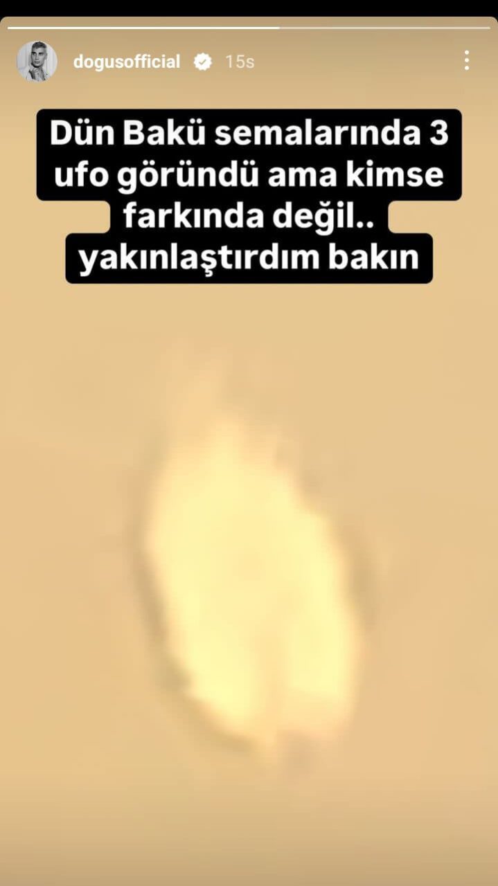 DurakMedya’dan Mustafa Barış Durak’ın haberine göre ünlü şarkıcı Yusuf Güney’den sonra Doğuş’ta uzaylılar hakkında açıklama yaptı. 3 adet UFO gördüğünü iddia eden ünlü şarkıcı bu durum karşısındaki şaşkınlığını takipçileri ile paylaştı. Ufolarlardan bir tanesinin yakınlaştırılmış resmini paylaşan Doğuş ” Dün Bakü semalarında 3 UFO göründü ama kimse farkında değil. Yakınlaştırdım bakın görün ” dedi. Ünlü şarkıcı uzaylıların yakında dünyaya gelebileceğinin de uyarısını yapmaktan kaçınmadı.