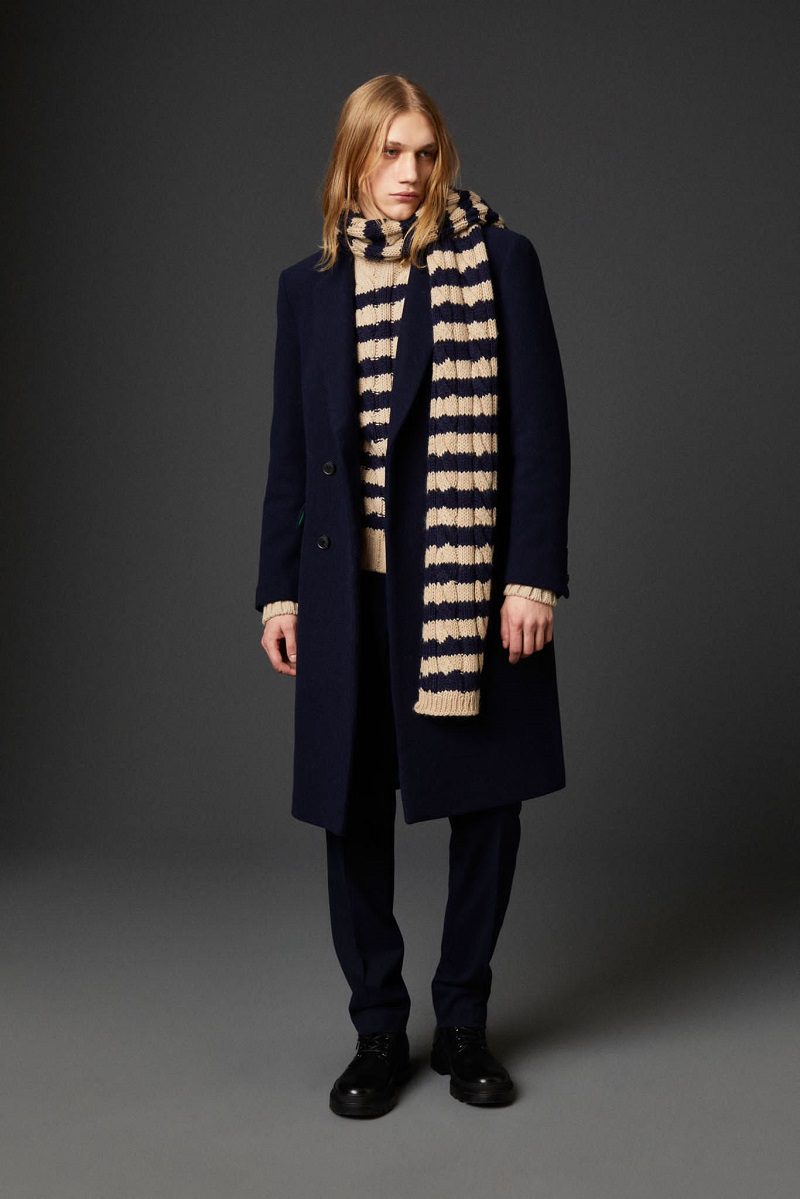 Erkek koleksiyonu parçalarında düz örgü kazaklar, balıkçı yakalar, oversize kalıplar, düğümlü hırkalar, nervürlü kazaklar ve kaşmir karışımı iplikler, dokulu yüzeyler ve ince çizgilerin yanı sıra baştan aşağı jakar ve hafif fırçalanmış bukle yünler öne çıkıyor. Trikoların günlük şıklığı, özel dikimli giysilerin sadeleştirilmiş çizgileriyle karışıyor: Spor paltolarda, tek düğmeli paltolarda, kruvaze ceketlerde, kabanlarda ve pilili pantolonlarda bu karışımın mükemmel sonuçları vurgulanıyor.