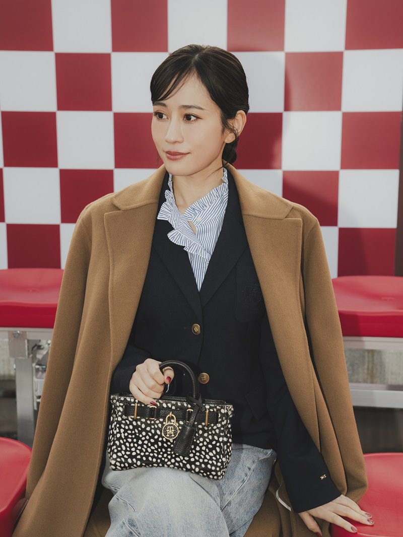 Atsuko Maeda: TOMMY HILFIGER Sonbahar 2025 Koleksiyonundan kemerli maksi palto, armalı blazer, fırfırlı poplin gömlek, bol paça jean, deri sneaker ve American Icon mikro tote çanta.