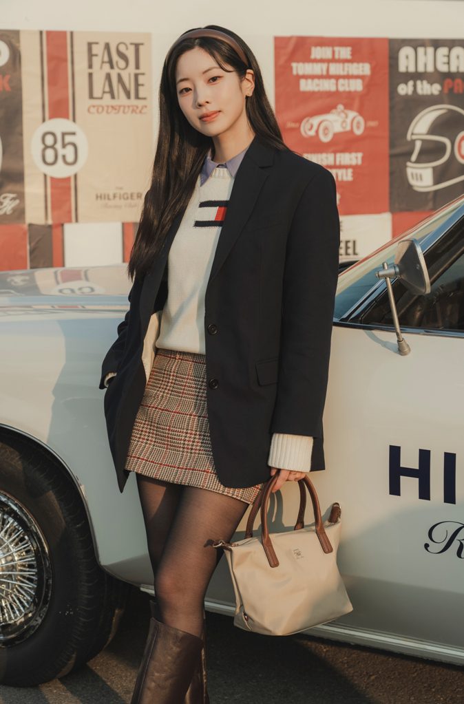 DAHYUN: TOMMY HILFIGER Sonbahar 2025 Koleksiyonundan uzun blazer ceket, TH Bayrak nakışlı kazak, tüvit mini etek ve binici çizmeleri.