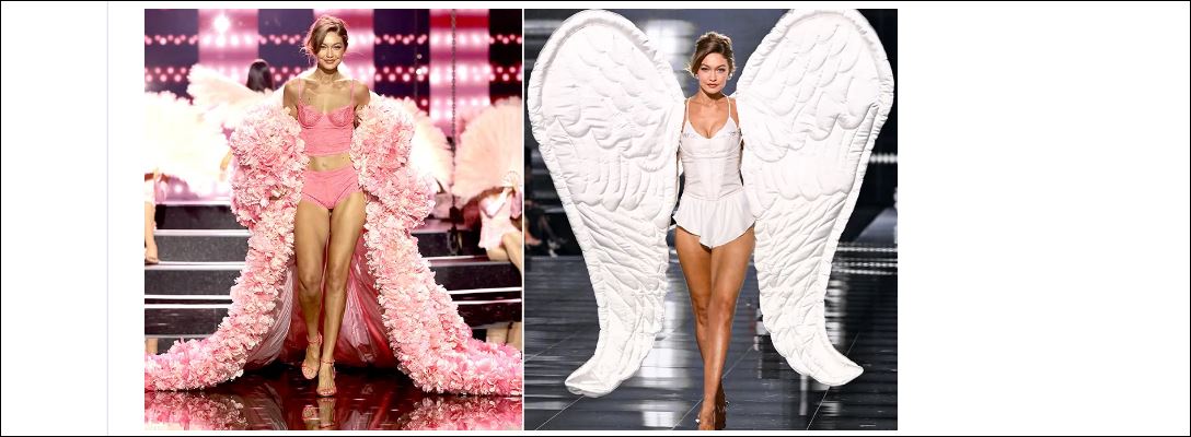 Gigi Hadid, defilede iki farklı kostümle yer aldı. İlk olarak, pembe çiçek desenli cape ve pembe kamisol takımıyla sahneye çıkan Hadid, ardından beyaz tek parça derin yırtmaçlı bir kostümle yeniden podyumda boy gösterdi. Her iki görünümde de zarif topuzu ve profesyonel yürüyüşüyle Victoria’s Secret ruhunu yeniden canlandırdı.